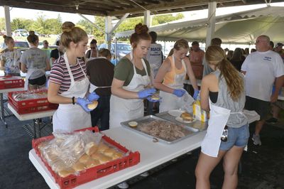 The process begins with 5,000 pounds of Round Roast. On Sunday morning, these roasts are unwrapped and seasoned with “Rudy’s Secret Recipe” in the high school cafeteria kitchen. They are then rewrapped in heavy foil and loaded onto a refrigerated truck for delivery to the Pit Area. Simultaneously, Buckeye Septic digs a 140-foot-long, 4-foot-wide, and 4-foot-deep pit. Nearby, 30 tons of slab wood are prepared to be loaded into the pit for burning, creating a bed of coals for cooking. At 5:30 p.m. on Sunday, the pit is officially lit. The wood burns for approximately two hours before volunteers add more wood to continue burning for another two hours. Around 9:30 p.m., additional wood is added to create a bed of coals about two feet deep. By 11:30 p.m., large wood chunks are removed, and the remaining coals are leveled with heavy-duty rakes. The coals are then covered with a thin layer of sand—30 tons of it. Next, the seasoned roasts are placed directly on the sand in the pit. To create an oven-like environment, the pit is covered with fence posts and sheet metal, which are further insulated with additional sand. Finally, a tarp is placed over the sheet metal and secured with more sand around the edges. This entire process, completed by volunteers using hand shovels, takes about two hours. The meat cooks overnight for approximately 12 hours until it is checked for doneness around 11:30 a.m. on Monday. Once approved by the Madison County Health Department, the roasts are removed from the pit and taken to the prep tent. Here, they are opened, drained of juice, any excess fat is trimmed, and then they are sliced by six slicers. The slices are then transferred to the sandwich-making area, where they are assembled into large sandwiches and served to the public